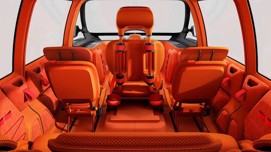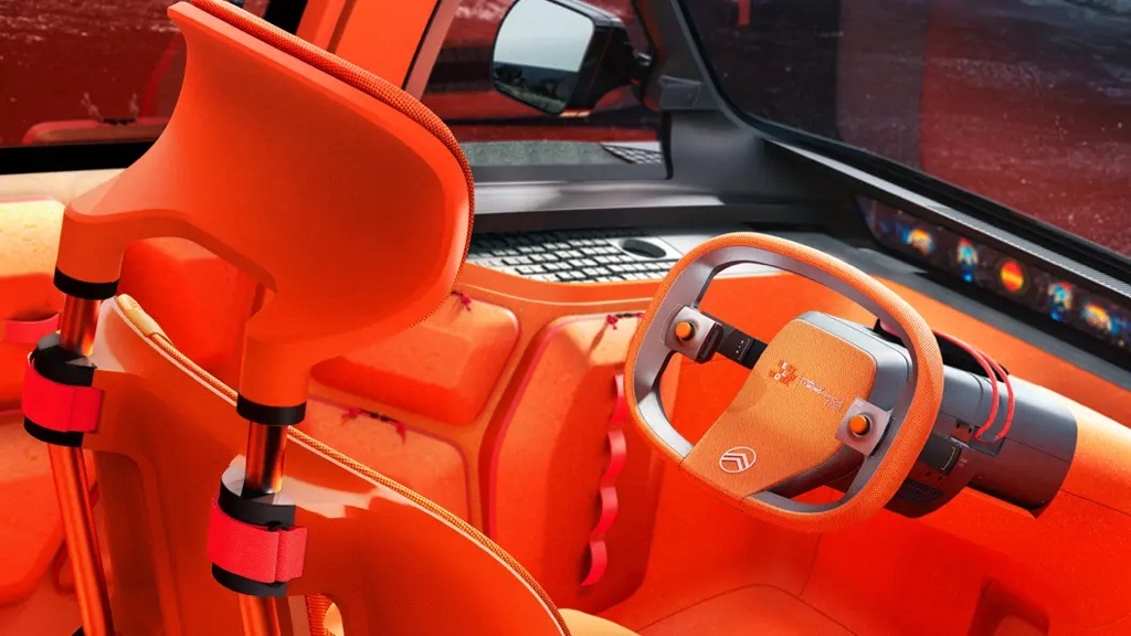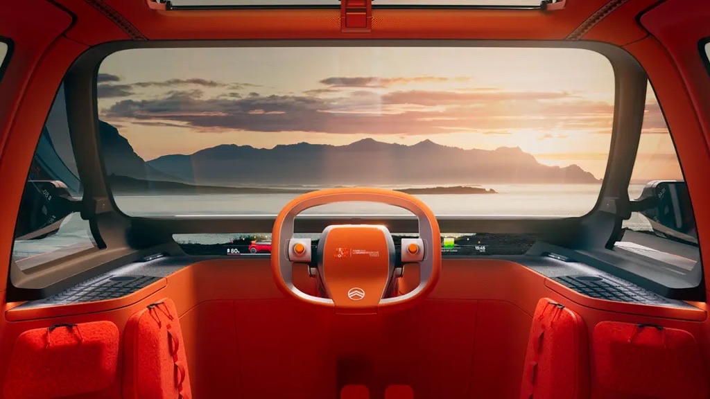 Inside, Citroën throws out every modern design convention. The ELO’s cabin is drenched in vibrant orange tones, shaped around modularity rather than dashboards full of screens.