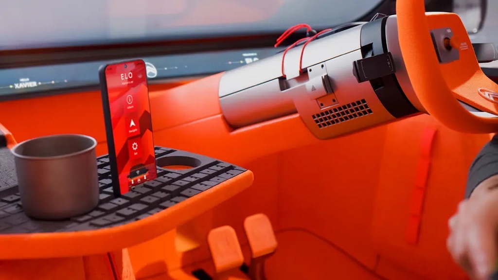 A slim display lives beneath the windshield, while the steering wheel is replaced by a joystick-inspired controller, proving that intuitive design doesn’t require a giant touchscreen.
