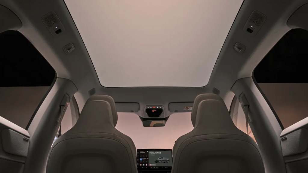 The centerpiece is a curved 15.1-inch OLED display with Google software, flanked by a narrow digital gauge cluster. Apple CarPlay and Android Auto are standard. The cabin emphasizes Scandinavian minimalism with premium materials throughout, and a clever design choice eliminates the traditional center console extension, creating a large storage bin below the dashboard for bags and personal items.