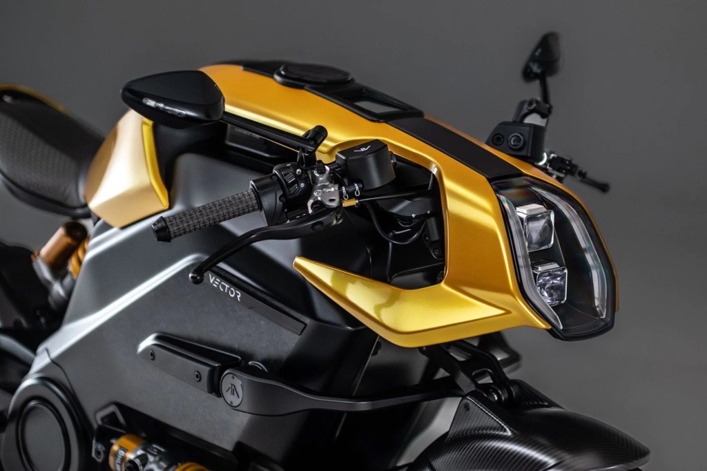 The Vector isn’t based on a standard bike: its carbon fibre monocoque frame serves as battery housing, motor mount, and chassis backbone. Such a design enables incredible stiffness and better weight distribution, giving the bike unmatched handling and a futuristic aesthetic.